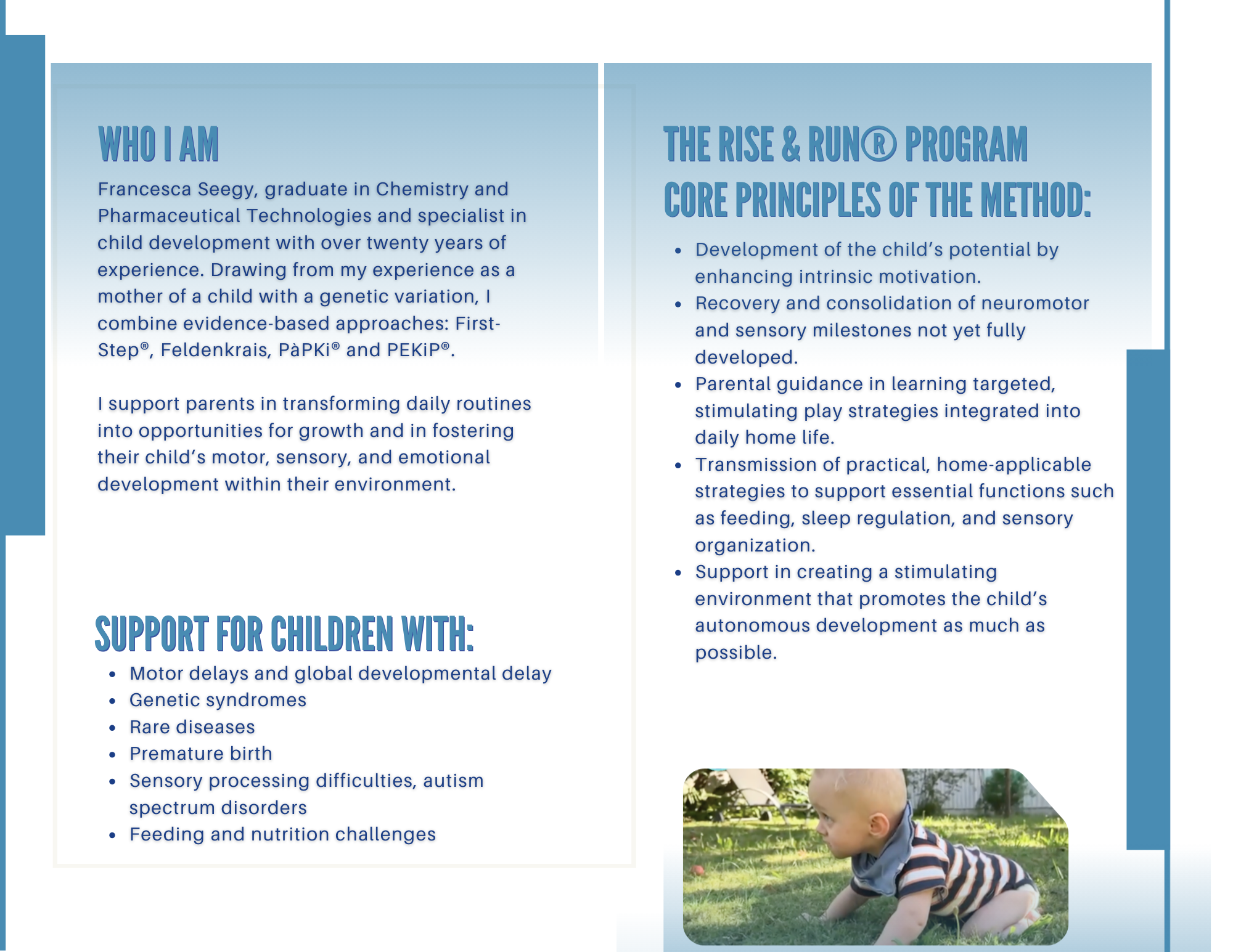 Die Erziehung eines Kindes mit Entwicklungsproblemen bringt tiefe Liebe, aber auch Ängste, Fragen und unerwartete Schwierigkeiten mit sich. Unterstützungsnetzwerke können sich dünn anfühlen, und die traditionelle Betreuung entspricht nicht immer dem, was Familien wirklich brauchen. Ich bin Francesca Seegy, eine Spezialistin für frühkindliche Entwicklung und eine Mutter, die diesen Weg selbst gegangen ist. Nach jahrelanger Suche nach einer eindeutigen Diagnose und sinnvoller Unterstützung für meinen Sohn wandte ich mich evidenzbasierten Methoden zu, die Familien über die Schulmedizin hinaus stärken. Auf der Grundlage der First-Step®-Methode, Feldenkrais, PäPKi® und PEKiP® unterstütze ich nun Familien in ganz Europa - von der Schweiz bis nach Deutschland, Italien, Frankreich und darüber hinaus - um Kindern zu helfen, eine bewegungsmäßige, sensorische und emotionale Grundlage für lebenslanges Wachstum zu schaffen.